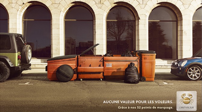 La publicité télé met en scène un bandit qui décide de changer de cible lorsqu’il aperçoit le crabe doré sur le véhicule qu’il s‘apprêtait à voler.