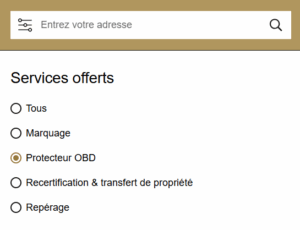 Le protecteur OBD est maintenant disponible auprès de plus de 100 dépositaires au Québec et en Ontario. Et la liste s’allonge à tous les jours! Pour trouver le dépositaire autorisé le plus près de chez vous, utilisez notre localisateur de dépositaires autorisés. Une fois votre adresse entrée, filtrer la recherche avec les filtres suivant :